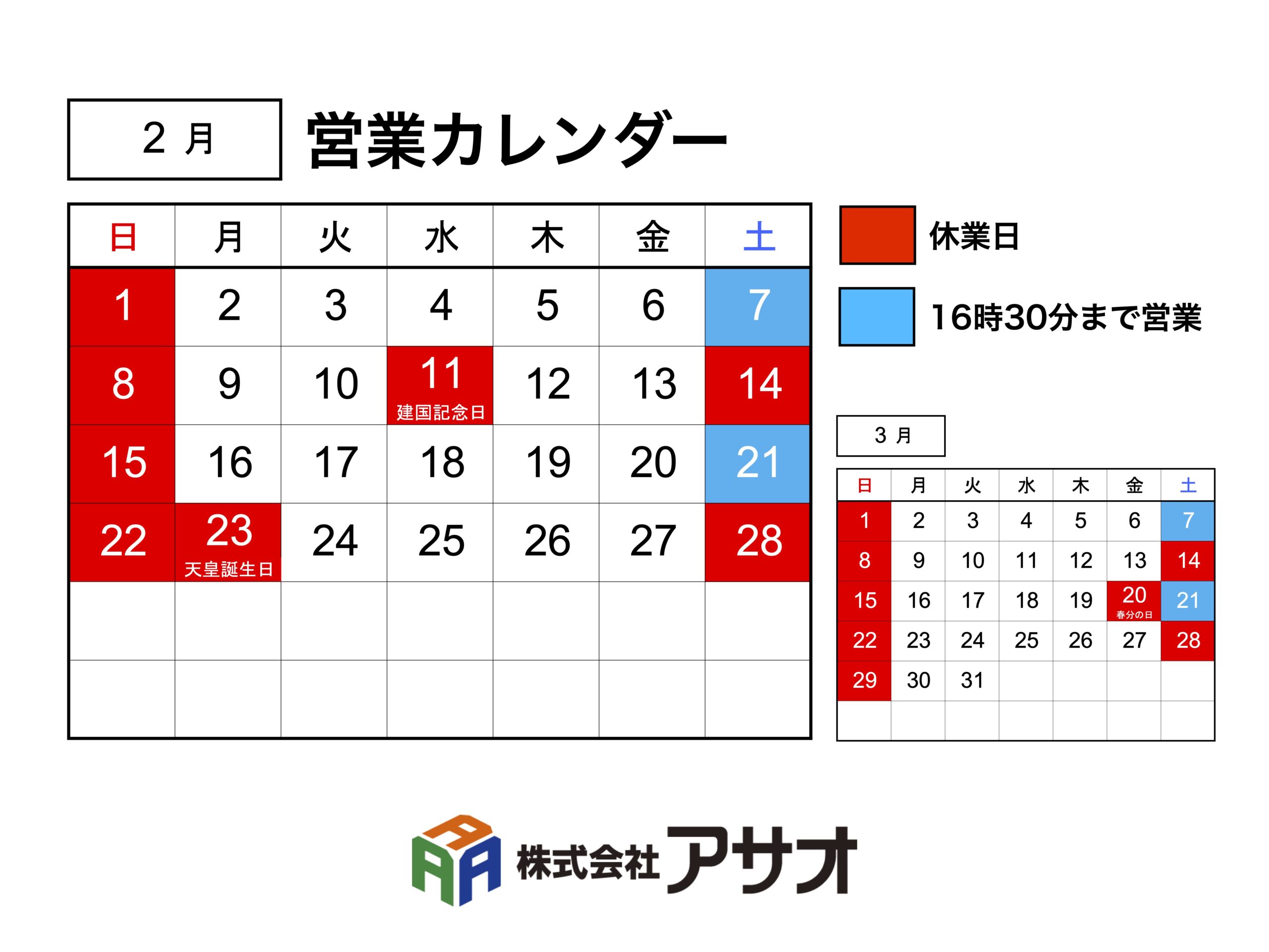 営業カレンダー【2026年2月】